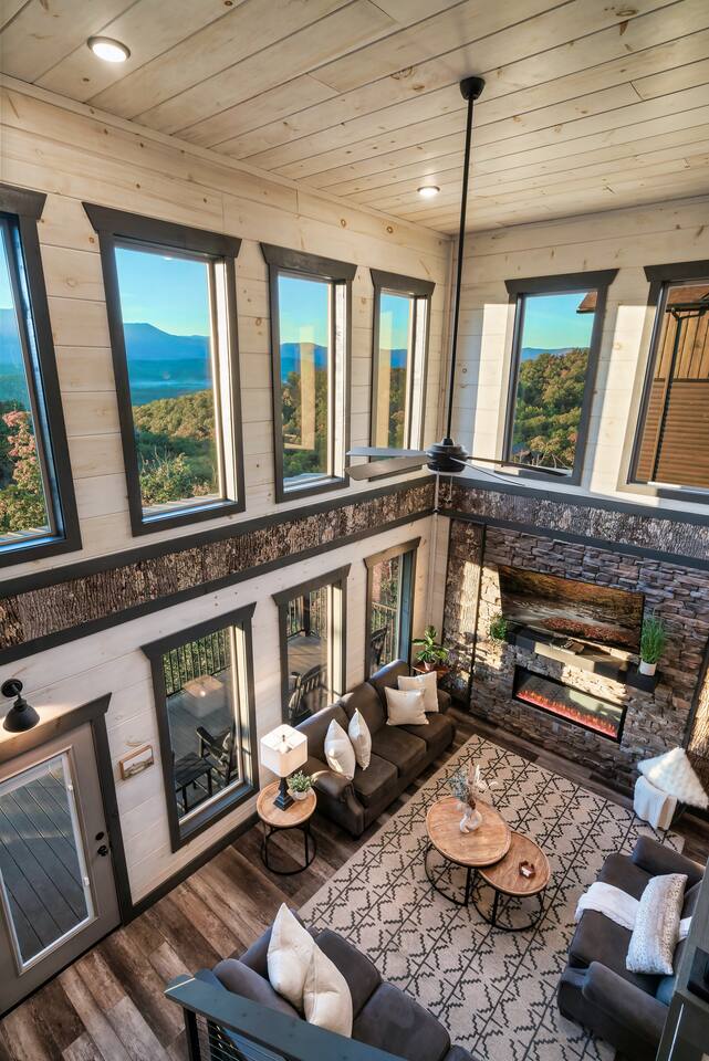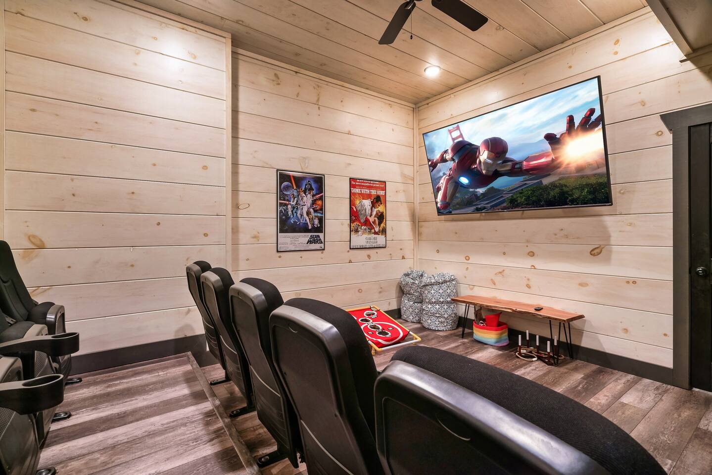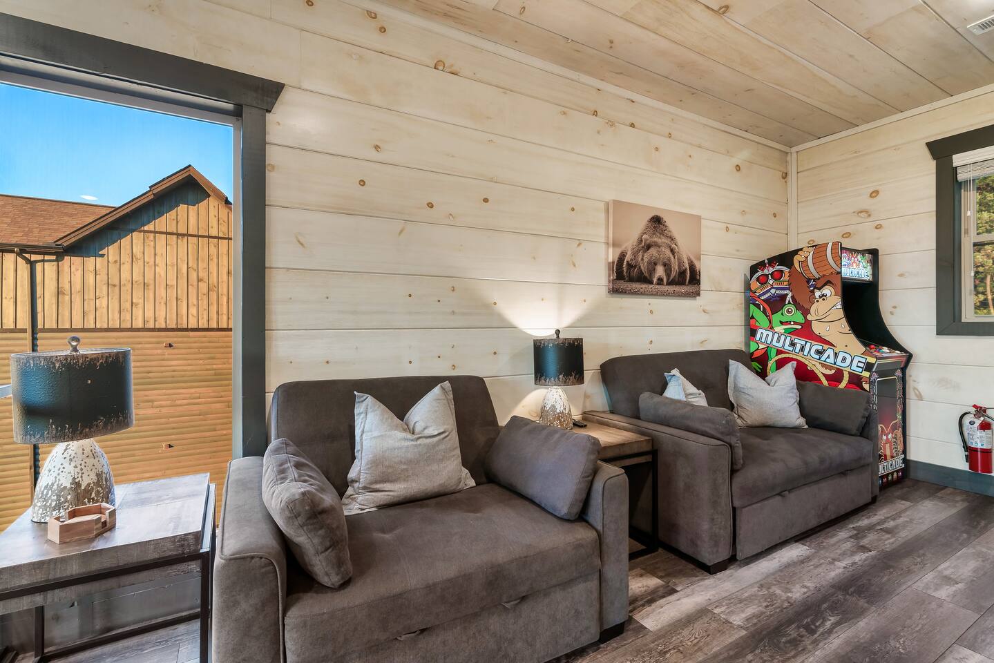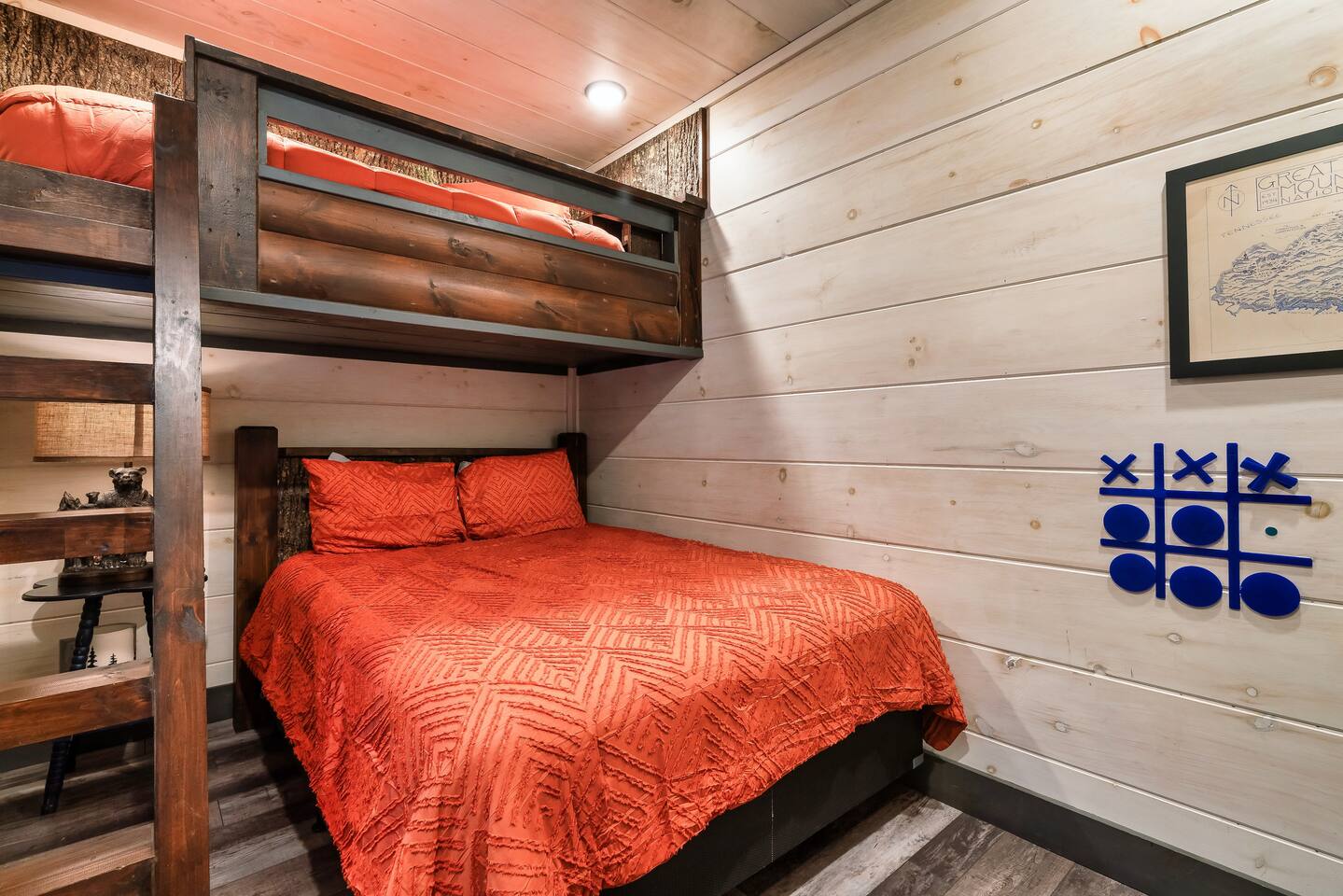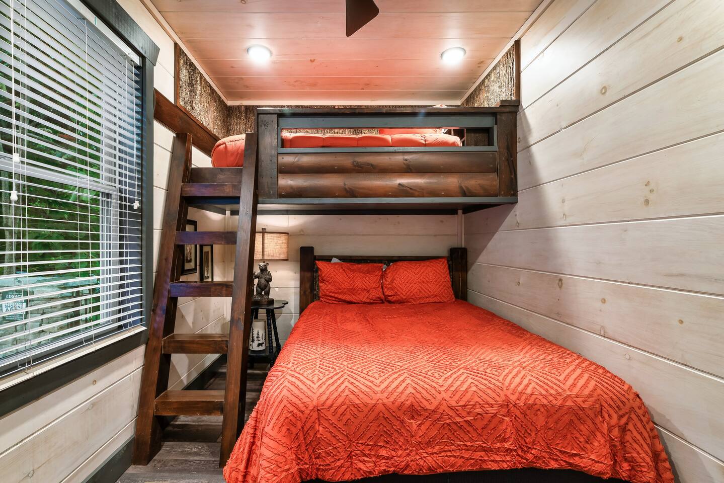5 Spacious Bedrooms ๐ Main Level Bedroom 1: En-Suite King Bed + Smart TV + Electric Fireplace ๐๏ธ Main Level Bedroom 2: Twin bunk bed over Queen bed + Smart TV ๐ Upper Level Bedroom 1: En-Suite King Bed + Smart TV ๐ Upper Level Bedroom 2: En-Suite King Bed + Smart TV ๐ Lower Level Bedroom: En-Suite King Bed + Smart TV ๐ณ Fully equipped kitchen, ready to create delicious feasts for your whole group ๐ฝ๏ธ! ๐๏ธ Large Living Room: Double stacks of windows for natural light & views, electric fireplace, TV ๐ฑ Loaded Game Room: Pool table, Infinity Arcade1Up, Nerf Gun Wall, Arcade game, Board games, TV, and stunning views ๐ง Private Heated Indoor Pool with soothing fountain ๐โโ๏ธ ๐ Private Deck 1 โ Soak in sweeping mountain vistas, sizzle dinner on the gas BBQ, and unwind in comfy rocking chairs ๐๏ธ๐๐ช ๐ Private Deck 2 โ Breathtaking views, relaxing hot tub, crackling fire pit, and cozy seating ๐๏ธ๐๐ฅ ๐ถ Complimentary High-Speed Internet โ Stream, work, or game โ๏ธ 3 ACs & Heating for your comfort ๐งบ Washer and Dryer ๐ฅ Outdoor small charcoal BBQ Grill ๐ก Clubhouse Access: Enjoy the large seasonal pool, steam room, sauna & gym Our spacious cabin comfortably sleeps 12 guests across 5 tastefully designed bedrooms, each with its own private bathroom for added privacy. The large, open-concept living area features high ceilings, oversized double stack of windows that showcase the spectacular mountain views, and plenty of space for gathering with your group. Step outside onto the expansive deck, where you'll be greeted by breathtaking views of the Smoky Hills. Sip your morning coffee while watching the sunrise, or relax in the evening as the stars fill the sky. ๐๏ธ BEDROOMS ๐๏ธ This stunning three-story cabin features five beautifully designed and luxurious bedrooms. Four of the bedrooms are furnished with king-sized beds and include private ensuite bathrooms for added comfort and privacy. The fifth bedroom, located on the main level, offers a twin-over-queen bed, perfect for accommodating additional guests. Three of the bedrooms showcase large windows that offer incredible views, while all bedrooms come equipped with flat-screen smart TVs for your entertainment. ๐ BATHROOMS ๐ The five bathrooms are conveniently located across three levels, with one on each level easily accessible from the common areas for added guest comfort. Four of the five bedrooms feature private ensuite bathrooms, offering extra privacy for each guest. The lower level includes a Jack and Jill bathroom, accessible from both the bedroom and the pool entrance. Each bathroom is beautifully appointed, boasting luxurious tile work, large modern vanities, and either a walk-in shower (four) or a relaxing bathtub (one). ๐ฉโ๐ณ KITCHEN & LOUNGE๐ฉโ๐ณ Enjoy preparing meals in the spacious, fully-equipped kitchen featuring stainless steel appliances, a large island, and ample pantry storage. Whether you're grabbing a quick snack at the island or gathering around the formal dining table for a full meal, this kitchen has everything you need, including a coffee maker, microwave, stove, oven, and all essential utensils. The open floor plan ensures that even with a full house, the kitchen remains comfortable and functional for everyone. Just beyond the kitchen, step into the stunning living room, where a high vaulted ceiling and a wall of double-height windows frame sweeping panoramic views. The space is anchored by a large electric fireplace, a flat-screen TV, and a luxurious sofa set, creating an inviting spot to relax and unwind. Whether you're savoring freshly prepared meals from the kitchen or simply lounging and soaking in the breathtaking sunrise or sunset, this living area is designed for making lasting memories together. ๐ POOL ๐ The lower level boasts a spacious private heated pool room, complete with a soothing fountain that adds a calming ambiance. Whether you're in the mood for a swim workout or a relaxing float, the tranquil sound of the fountain enhances the experience. A conveniently located adjoining bathroom provides both privacy and ease. The pool room also includes a comfortable seating area, with glass doors that open to the deck, allowing natural light to flood the space while offering picturesque views. ๐โจ๏ธ HOT TUB โจ๏ธ๐ Situated on the lower deck, the hot tub provides a private oasis where guests can unwind while taking in stunning panoramic views. It comfortably accommodates up to five people, offering the perfect spot to relax and enjoy the serene surroundings. ๐ฅ MOVIE THEATER ๐ฅ Head down to the lower-level theater room for an immersive movie experience, complete with your favorite snacks. Whether you're watching classic films, contemporary hits, or bringing your own videos, this space offers seating for 11 guests with additional room to spare, making it the ideal setting for a cozy movie night. โฅ๏ธโฅ๏ธBook today and make priceless memories!