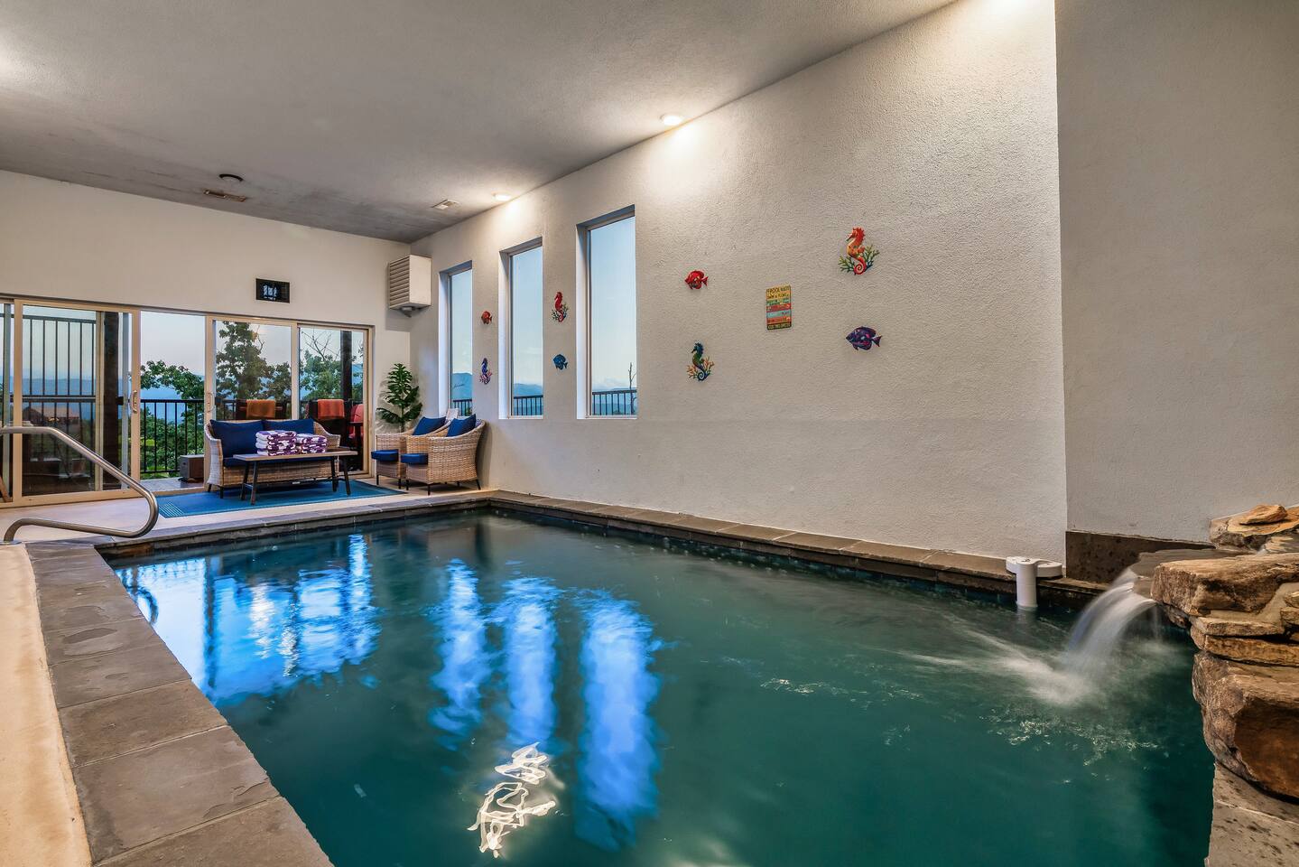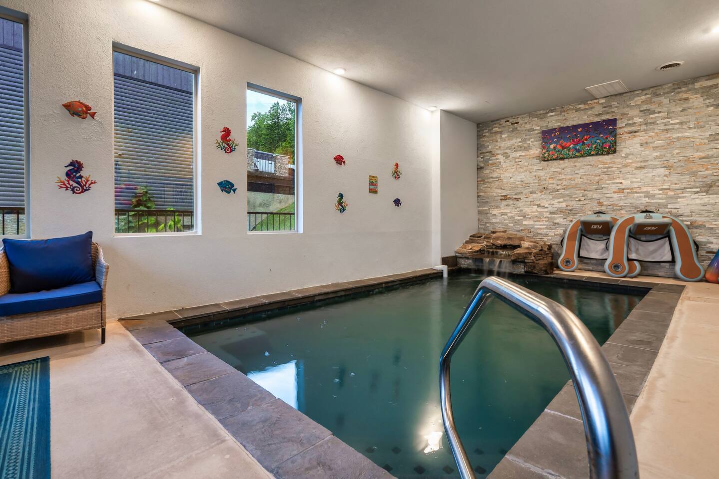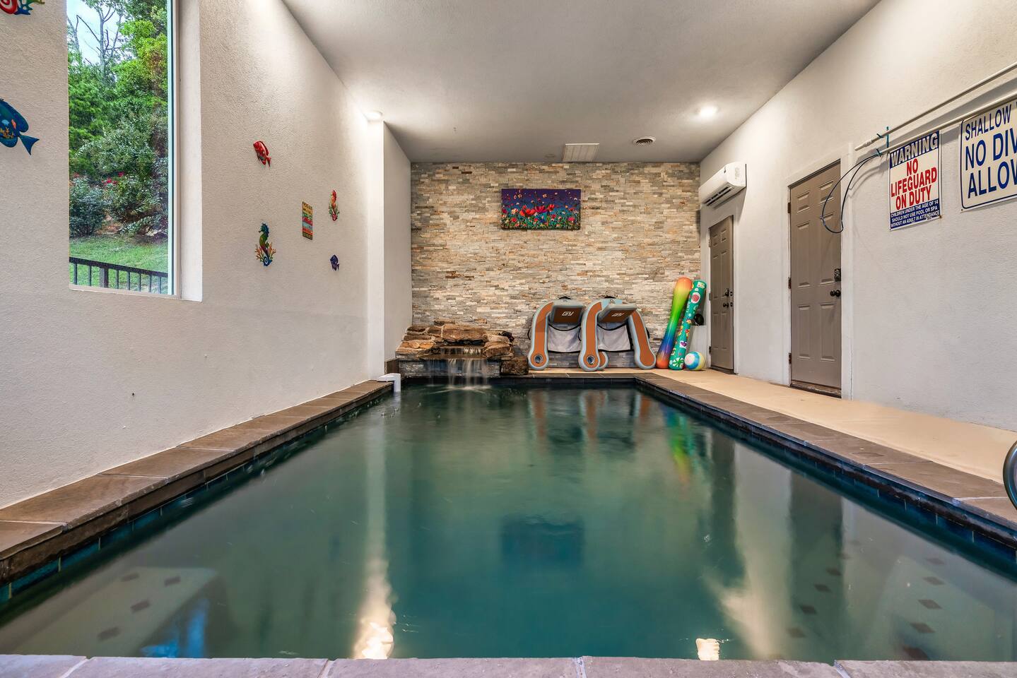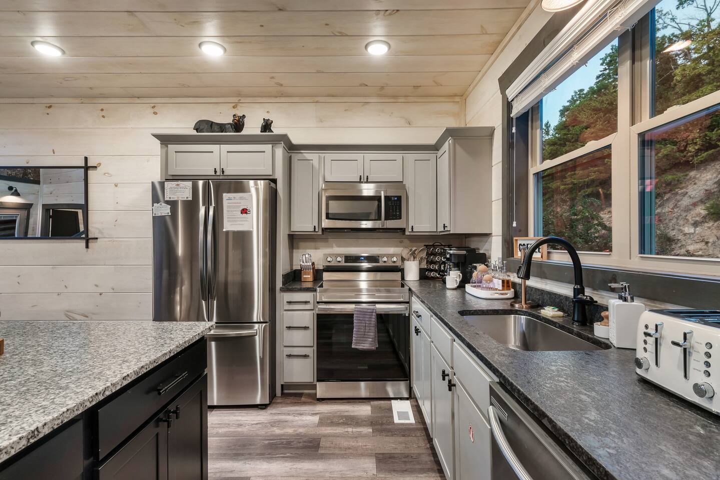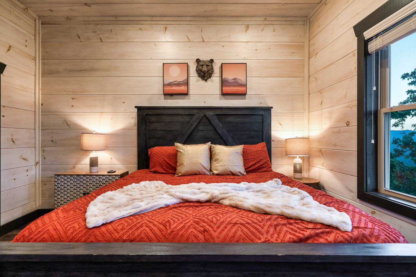 5 Spacious Bedrooms ๐ Main Level Bedroom 1: En-Suite King Bed + Smart TV + Electric Fireplace ๐๏ธ Main Level Bedroom 2: Twin bunk bed over Queen bed + Smart TV ๐ Upper Level Bedroom 1: En-Suite King Bed + Smart TV ๐ Upper Level Bedroom 2: En-Suite King Bed + Smart TV ๐ Lower Level Bedroom: En-Suite King Bed + Smart TV ๐ณ Fully equipped kitchen, ready to create delicious feasts for your whole group ๐ฝ๏ธ! ๐๏ธ Large Living Room: Double stacks of windows for natural light & views, electric fireplace, TV ๐ฑ Loaded Game Room: Pool table, Infinity Arcade1Up, Nerf Gun Wall, Arcade game, Board games, TV, and stunning views ๐ง Private Heated Indoor Pool with soothing fountain ๐โโ๏ธ ๐ Private Deck 1 โ Soak in sweeping mountain vistas, sizzle dinner on the gas BBQ, and unwind in comfy rocking chairs ๐๏ธ๐๐ช ๐ Private Deck 2 โ Breathtaking views, relaxing hot tub, crackling fire pit, and cozy seating ๐๏ธ๐๐ฅ ๐ถ Complimentary High-Speed Internet โ Stream, work, or game โ๏ธ 3 ACs & Heating for your comfort ๐งบ Washer and Dryer ๐ฅ Outdoor small charcoal BBQ Grill ๐ก Clubhouse Access: Enjoy the large seasonal pool, steam room, sauna & gym Our spacious cabin comfortably sleeps 12 guests across 5 tastefully designed bedrooms, each with its own private bathroom for added privacy. The large, open-concept living area features high ceilings, oversized double stack of windows that showcase the spectacular mountain views, and plenty of space for gathering with your group. Step outside onto the expansive deck, where you'll be greeted by breathtaking views of the Smoky Hills. Sip your morning coffee while watching the sunrise, or relax in the evening as the stars fill the sky. ๐๏ธ BEDROOMS ๐๏ธ This stunning three-story cabin features five beautifully designed and luxurious bedrooms. Four of the bedrooms are furnished with king-sized beds and include private ensuite bathrooms for added comfort and privacy. The fifth bedroom, located on the main level, offers a twin-over-queen bed, perfect for accommodating additional guests. Three of the bedrooms showcase large windows that offer incredible views, while all bedrooms come equipped with flat-screen smart TVs for your entertainment. ๐ BATHROOMS ๐ The five bathrooms are conveniently located across three levels, with one on each level easily accessible from the common areas for added guest comfort. Four of the five bedrooms feature private ensuite bathrooms, offering extra privacy for each guest. The lower level includes a Jack and Jill bathroom, accessible from both the bedroom and the pool entrance. Each bathroom is beautifully appointed, boasting luxurious tile work, large modern vanities, and either a walk-in shower (four) or a relaxing bathtub (one). ๐ฉโ๐ณ KITCHEN & LOUNGE๐ฉโ๐ณ Enjoy preparing meals in the spacious, fully-equipped kitchen featuring stainless steel appliances, a large island, and ample pantry storage. Whether you're grabbing a quick snack at the island or gathering around the formal dining table for a full meal, this kitchen has everything you need, including a coffee maker, microwave, stove, oven, and all essential utensils. The open floor plan ensures that even with a full house, the kitchen remains comfortable and functional for everyone. Just beyond the kitchen, step into the stunning living room, where a high vaulted ceiling and a wall of double-height windows frame sweeping panoramic views. The space is anchored by a large electric fireplace, a flat-screen TV, and a luxurious sofa set, creating an inviting spot to relax and unwind. Whether you're savoring freshly prepared meals from the kitchen or simply lounging and soaking in the breathtaking sunrise or sunset, this living area is designed for making lasting memories together. ๐ POOL ๐ The lower level boasts a spacious private heated pool room, complete with a soothing fountain that adds a calming ambiance. Whether you're in the mood for a swim workout or a relaxing float, the tranquil sound of the fountain enhances the experience. A conveniently located adjoining bathroom provides both privacy and ease. The pool room also includes a comfortable seating area, with glass doors that open to the deck, allowing natural light to flood the space while offering picturesque views. ๐โจ๏ธ HOT TUB โจ๏ธ๐ Situated on the lower deck, the hot tub provides a private oasis where guests can unwind while taking in stunning panoramic views. It comfortably accommodates up to five people, offering the perfect spot to relax and enjoy the serene surroundings. ๐ฅ MOVIE THEATER ๐ฅ Head down to the lower-level theater room for an immersive movie experience, complete with your favorite snacks. Whether you're watching classic films, contemporary hits, or bringing your own videos, this space offers seating for 11 guests with additional room to spare, making it the ideal setting for a cozy movie night. โฅ๏ธโฅ๏ธBook today and make priceless memories!