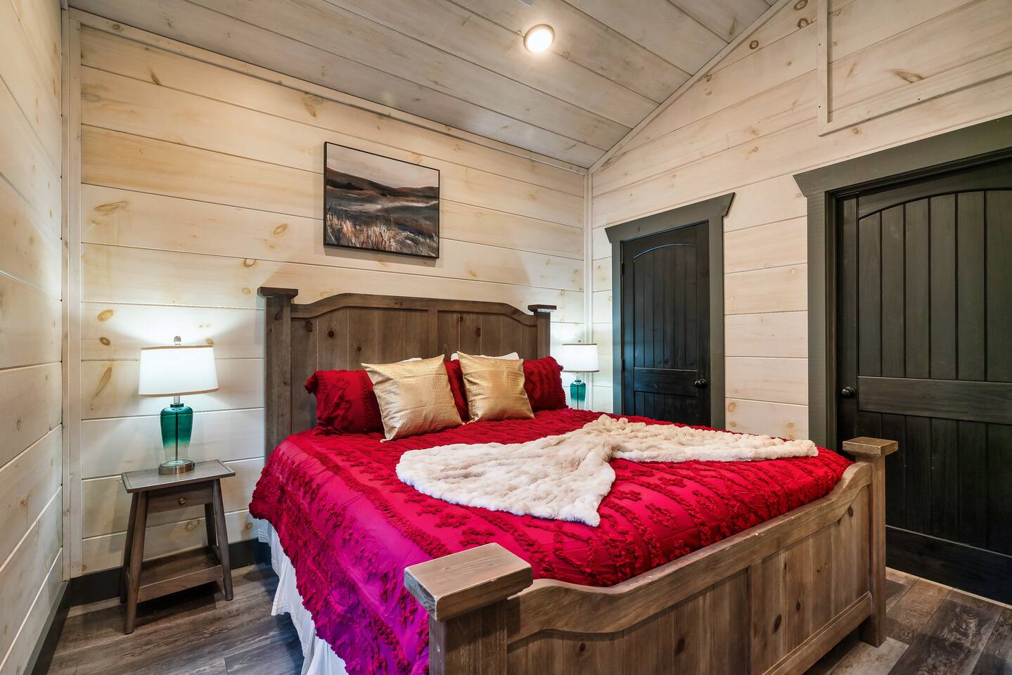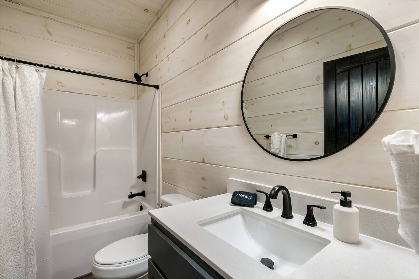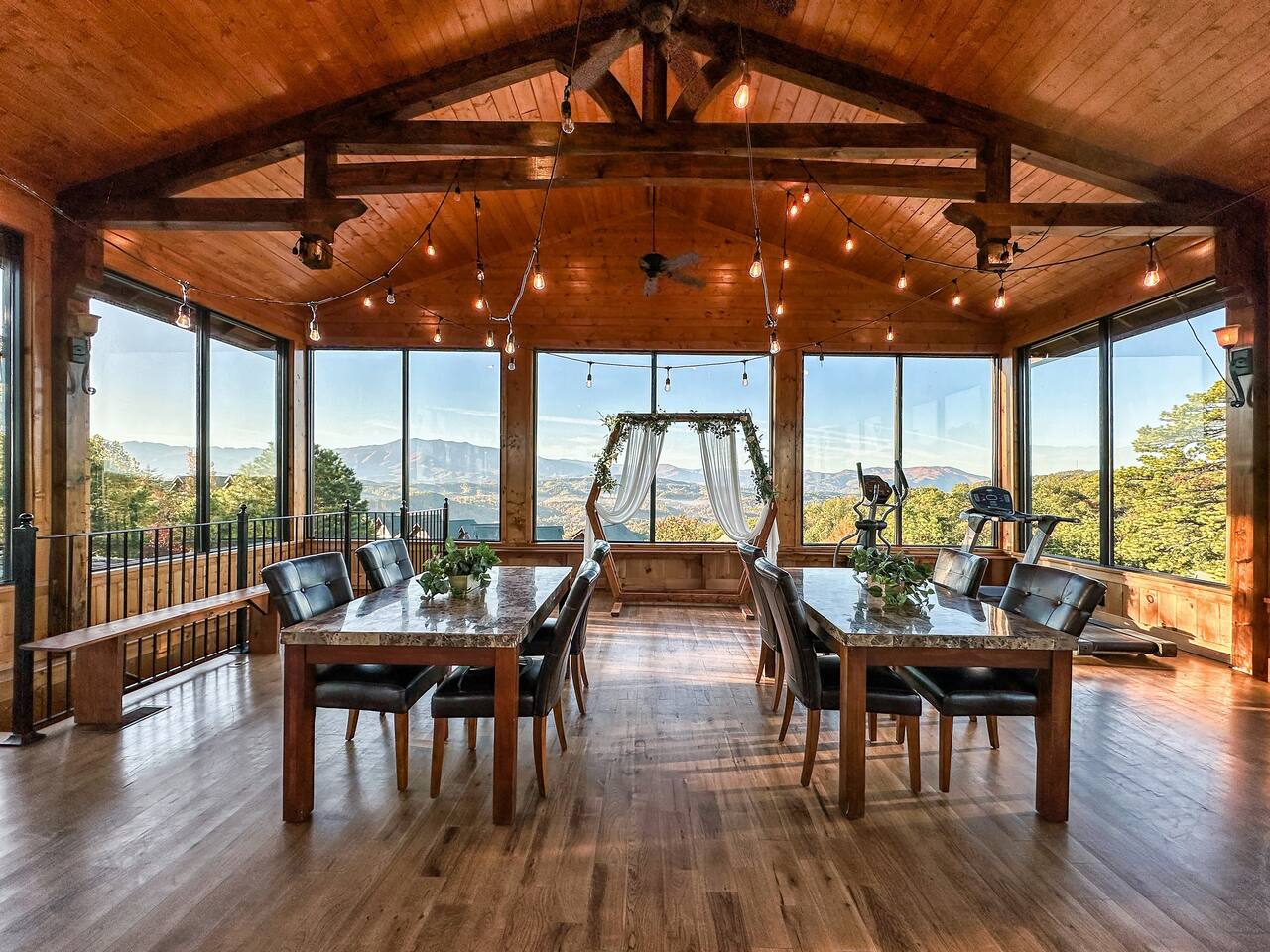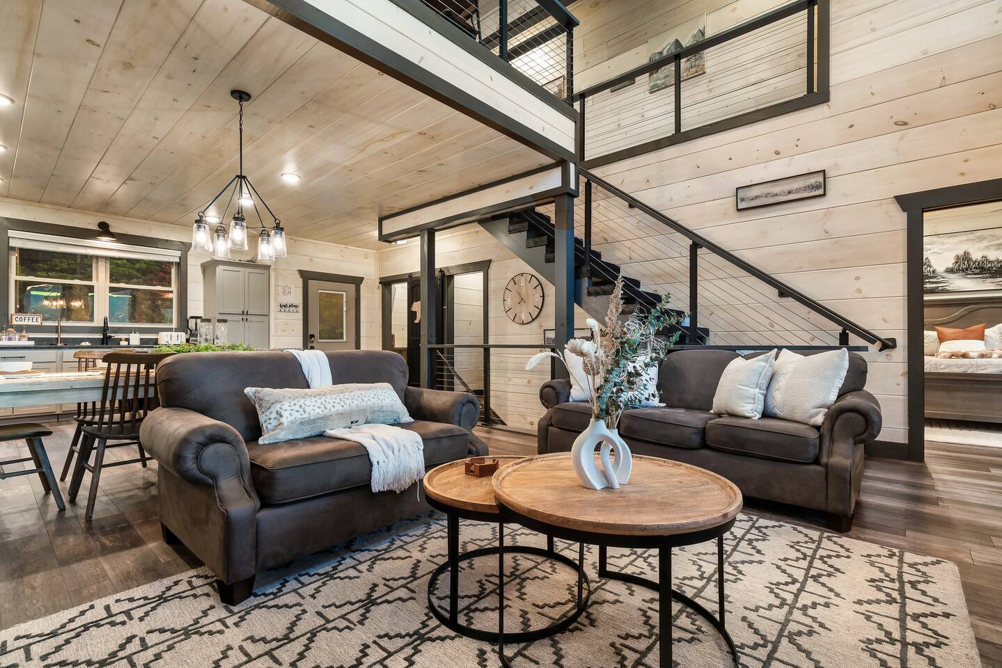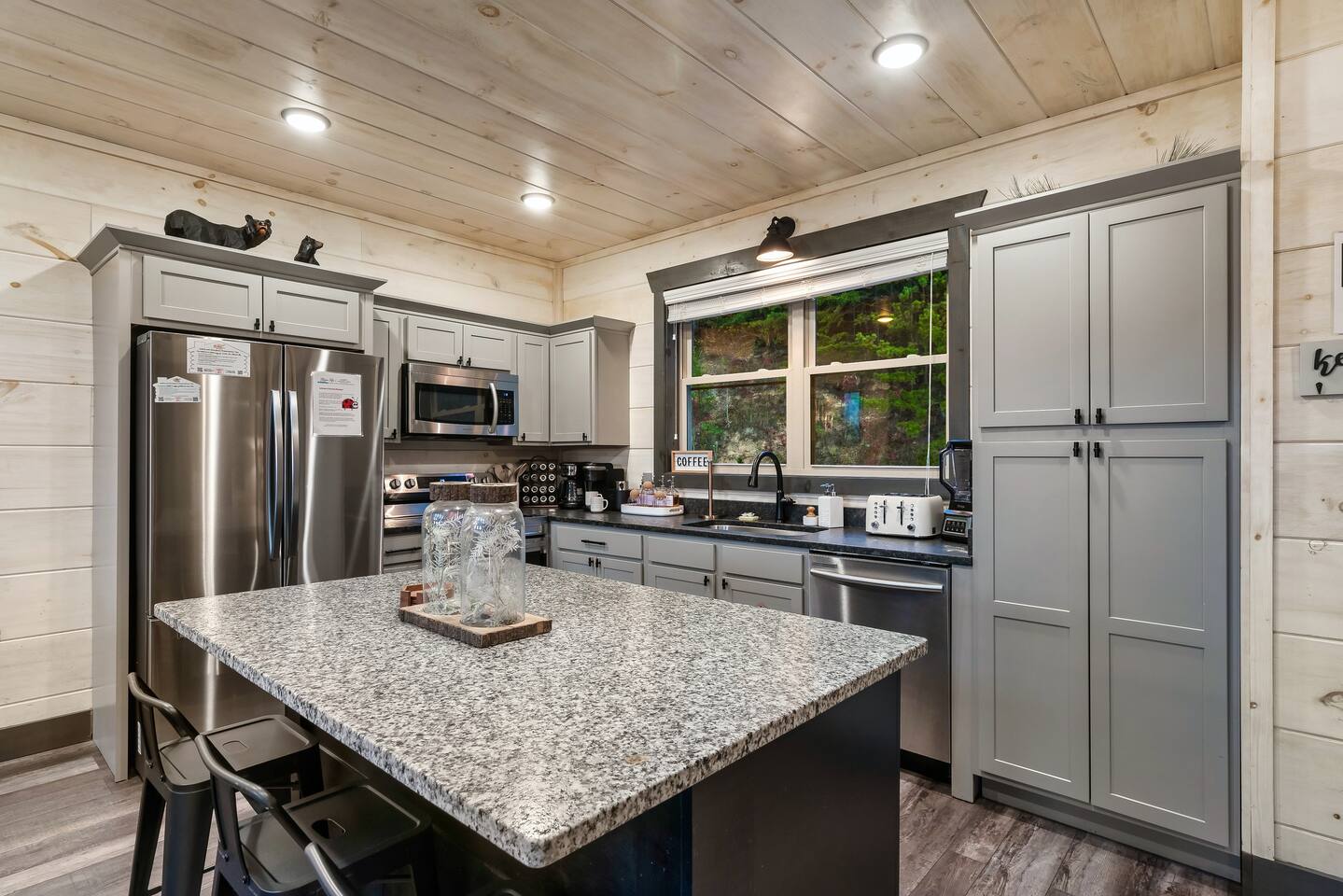 5 Spacious Bedrooms ๐ Main Level Bedroom 1: En-Suite King Bed + Smart TV + Electric Fireplace ๐๏ธ Main Level Bedroom 2: Twin bunk bed over Queen bed + Smart TV ๐ Upper Level Bedroom 1: En-Suite King Bed + Smart TV ๐ Upper Level Bedroom 2: En-Suite King Bed + Smart TV ๐ Lower Level Bedroom: En-Suite King Bed + Smart TV ๐ณ Fully equipped kitchen, ready to create delicious feasts for your whole group ๐ฝ๏ธ! ๐๏ธ Large Living Room: Double stacks of windows for natural light & views, electric fireplace, TV ๐ฑ Loaded Game Room: Pool table, Infinity Arcade1Up, Nerf Gun Wall, Arcade game, Board games, TV, and stunning views ๐ง Private Heated Indoor Pool with soothing fountain ๐โโ๏ธ ๐ Private Deck 1 โ Soak in sweeping mountain vistas, sizzle dinner on the gas BBQ, and unwind in comfy rocking chairs ๐๏ธ๐๐ช ๐ Private Deck 2 โ Breathtaking views, relaxing hot tub, crackling fire pit, and cozy seating ๐๏ธ๐๐ฅ ๐ถ Complimentary High-Speed Internet โ Stream, work, or game โ๏ธ 3 ACs & Heating for your comfort ๐งบ Washer and Dryer ๐ฅ Outdoor small charcoal BBQ Grill ๐ก Clubhouse Access: Enjoy the large seasonal pool, steam room, sauna & gym Our spacious cabin comfortably sleeps 12 guests across 5 tastefully designed bedrooms, each with its own private bathroom for added privacy. The large, open-concept living area features high ceilings, oversized double stack of windows that showcase the spectacular mountain views, and plenty of space for gathering with your group. Step outside onto the expansive deck, where you'll be greeted by breathtaking views of the Smoky Hills. Sip your morning coffee while watching the sunrise, or relax in the evening as the stars fill the sky. ๐๏ธ BEDROOMS ๐๏ธ This stunning three-story cabin features five beautifully designed and luxurious bedrooms. Four of the bedrooms are furnished with king-sized beds and include private ensuite bathrooms for added comfort and privacy. The fifth bedroom, located on the main level, offers a twin-over-queen bed, perfect for accommodating additional guests. Three of the bedrooms showcase large windows that offer incredible views, while all bedrooms come equipped with flat-screen smart TVs for your entertainment. ๐ BATHROOMS ๐ The five bathrooms are conveniently located across three levels, with one on each level easily accessible from the common areas for added guest comfort. Four of the five bedrooms feature private ensuite bathrooms, offering extra privacy for each guest. The lower level includes a Jack and Jill bathroom, accessible from both the bedroom and the pool entrance. Each bathroom is beautifully appointed, boasting luxurious tile work, large modern vanities, and either a walk-in shower (four) or a relaxing bathtub (one). ๐ฉโ๐ณ KITCHEN & LOUNGE๐ฉโ๐ณ Enjoy preparing meals in the spacious, fully-equipped kitchen featuring stainless steel appliances, a large island, and ample pantry storage. Whether you're grabbing a quick snack at the island or gathering around the formal dining table for a full meal, this kitchen has everything you need, including a coffee maker, microwave, stove, oven, and all essential utensils. The open floor plan ensures that even with a full house, the kitchen remains comfortable and functional for everyone. Just beyond the kitchen, step into the stunning living room, where a high vaulted ceiling and a wall of double-height windows frame sweeping panoramic views. The space is anchored by a large electric fireplace, a flat-screen TV, and a luxurious sofa set, creating an inviting spot to relax and unwind. Whether you're savoring freshly prepared meals from the kitchen or simply lounging and soaking in the breathtaking sunrise or sunset, this living area is designed for making lasting memories together. ๐ POOL ๐ The lower level boasts a spacious private heated pool room, complete with a soothing fountain that adds a calming ambiance. Whether you're in the mood for a swim workout or a relaxing float, the tranquil sound of the fountain enhances the experience. A conveniently located adjoining bathroom provides both privacy and ease. The pool room also includes a comfortable seating area, with glass doors that open to the deck, allowing natural light to flood the space while offering picturesque views. ๐โจ๏ธ HOT TUB โจ๏ธ๐ Situated on the lower deck, the hot tub provides a private oasis where guests can unwind while taking in stunning panoramic views. It comfortably accommodates up to five people, offering the perfect spot to relax and enjoy the serene surroundings. ๐ฅ MOVIE THEATER ๐ฅ Head down to the lower-level theater room for an immersive movie experience, complete with your favorite snacks. Whether you're watching classic films, contemporary hits, or bringing your own videos, this space offers seating for 11 guests with additional room to spare, making it the ideal setting for a cozy movie night. โฅ๏ธโฅ๏ธBook today and make priceless memories!